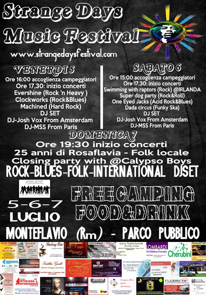 Ai nastri di partenza “Strange Days Music Festival” la piccola Woodstock che partirà venerdì nel parco pubblico di Monteflavio. I concerti iniziano alle ore 17.30 con Evershine, Clockworks e Machined, mentre il dj set di fine serata sarà affidato a Dj JoshVox From Amsterdam, Dj MSS From Paris, che concluderanno anche quelle di sabato e domenica. Sabato appuntamento sempre alla stessa ora con Swimming with raptors, Super dog party, One Eyed Jacks e Dada Circus. Domenica gran finale con i Rosaflavia, che festeggia i 25 anni di attività, e con i Calypso Boys. Free camping, food e drink per tutti.