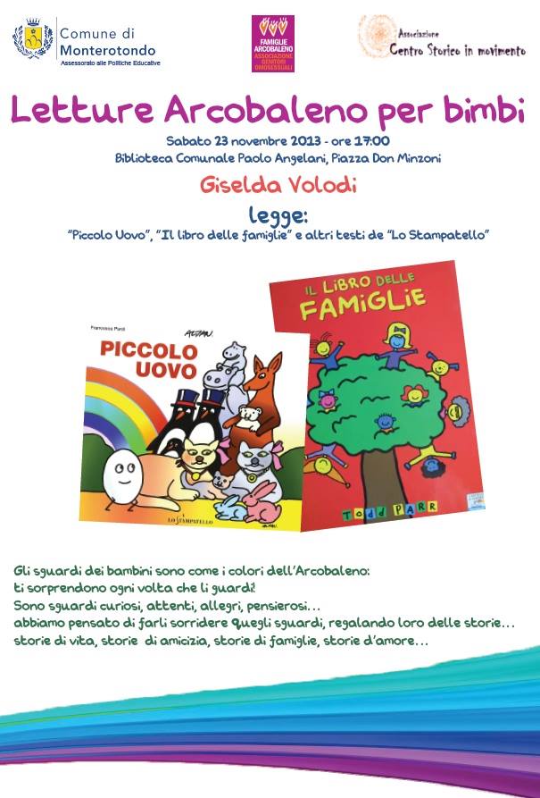 Monterotondo, un pomeriggio dedicato ai bambini con “Letture Arcobaleno per bimbi”. L’appuntamento è per sabato 23 novembre alle 17 presso Biblioteca Comunale Paolo Angelani in piazza Don Minzoni. Storie lette da Gisella Valodi.