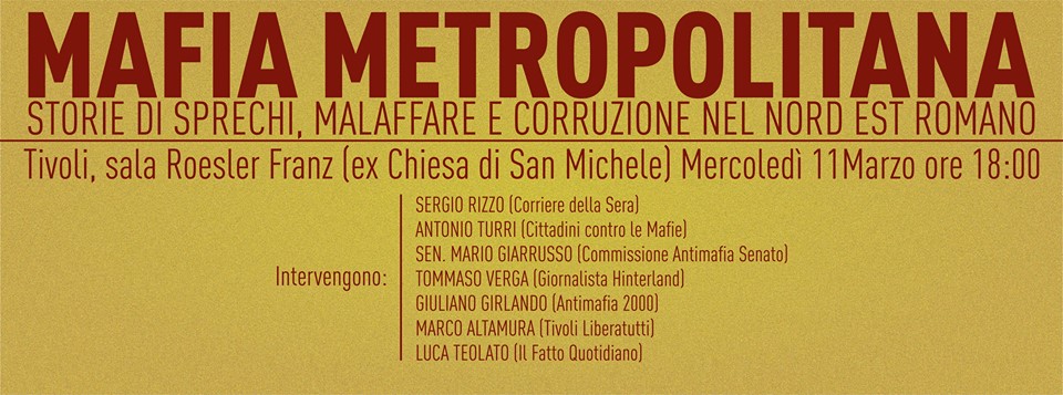 Appuntamento mercoledì pomeriggio alle ore 18 presso la Sala Roesler Franz, ex Chiesa San Michele, a Tivoli con “Mafia Metropolitana. Storie di sprechi, malaffare e corruzione nel nord”. A parlarne saranno Sergio Rizzo, giornalista de “Il Corriere della Sera”, Antonio Turri, “Cittadini contro le Mafie”, Mario Giarrusso, commissione Antimafia del Senato, Tommaso Verga, giornalista Hinterland, Giuliano Girlando, Antimafia 2000, Marco Altamura, Tivoli Liberatutti, Luca Teolato, “ll Fatto quotidiano”. “Oltre 50 eventi per rompere il silenzio sulle mafie e la corruzione, fare di Roma un palcoscenico di democrazia e impegno antimafia, creare un laboratorio di idee e buone pratiche per costruire il futuro della città – dicono gli organizzatori -. Questo, e molto altro, è “Spiazziamoli – 50 piazze per la democrazia e contro le mafie”, la più grande, decisa e partecipata risposta a Mafia Capitale”.