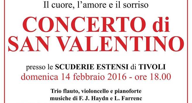 L’Associazione Culturale “Cavalieri di Santo Stefano” ha organizzato per domenica 14 febbraio il Concerto di San Valentino. Si esibirà il trio flauto, violoncello e pianoforte composto rispettivamente da Carlotta Paolacci, Alessandro Muller e Cristina Biagini. Musiche di F. J. Haydn e L. Farrene. Il concerto sarà preceduto dalla lettura di poesie dell’attrice Giorgia Palmucci, dalla partecipazione di studenti del Liceo Classico “Amedeo di Savoia” di Tivoli coadiuvati dalla professoressa Mariella Losito. Interverranno anche Paolo Paolacci e Sandra Vignoli. L’ingresso è libero e l’appuntamento è alle ore 18 presso le Scuderie Estensi di Tivoli. Per maggiori informazioni clicca qui.