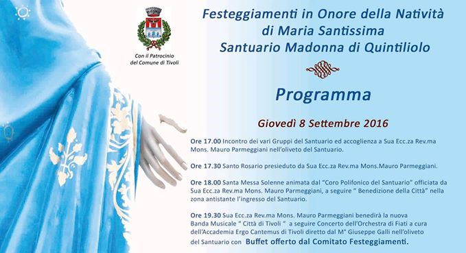 ORE 19.30: Sua Ecc.za Rev.ma Mons. Mauro Parmeggiani benedirà la nuova Banda Musicale “Città di Tivoli”; a seguire Concerto dell’Orchestra di Fiati a cura dell’Accademia Ergo Cantemus di Tivoli. A seguire Buffet offerto dal Comitato Festeggiamenti.