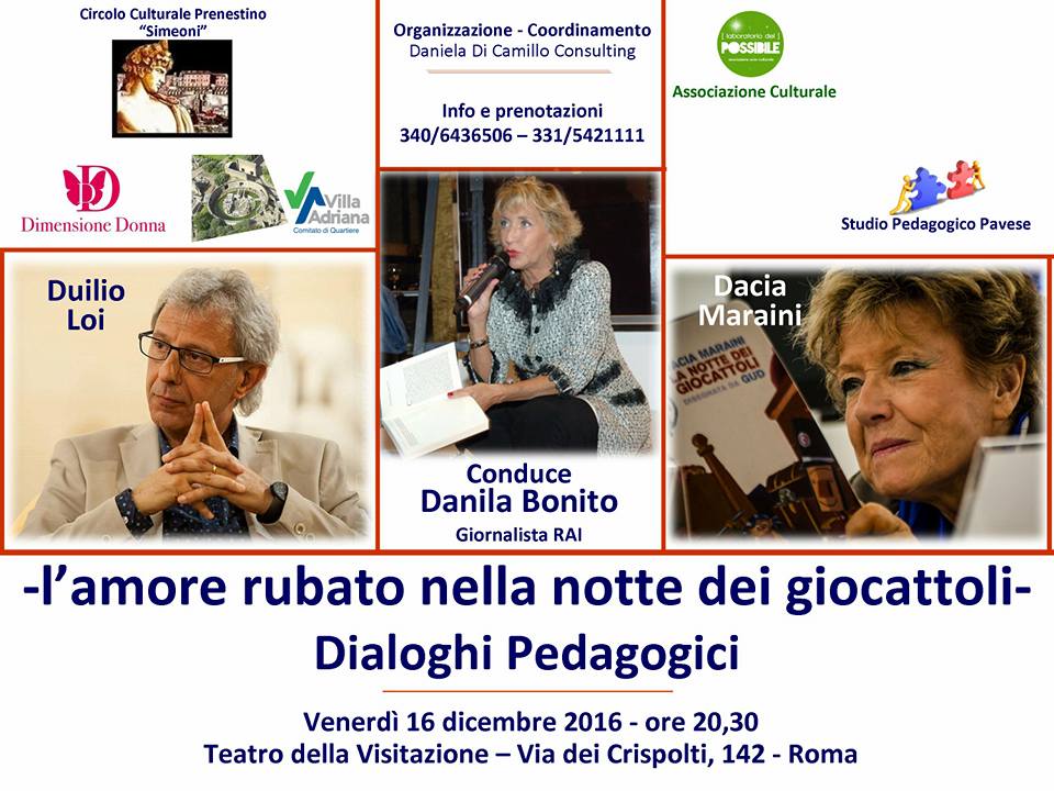 Il Laboratorio del Possibile, un’associazione socio-culturale di Tivoli, in collaborazione con il “Circolo Culturale Prenestino R. Simeoni“, l’Associazione “Dimensione Donna” e il Comitato di Quartiere Villa Adriana e tutti i Professionisti che collaborano attivamente ai progetti del Laboratorio avranno l’onore e il piacere di ospitare presso il Teato della Vistiazione a Roma, in Via dei Crispolti n. 42, alle 20.30 del 16 Dicembre 2016,  tre interpreti del giornalismo, della letteratura e di teatro. Tre donne, Danila Bonito, Dacia Maraini e Agnese Nano, che tenendosi per mano ad un Uomo, il Dr. Duilio Loi, Pedagogista clinico e Criminologo Forense,  si confronteranno e si interrogheranno sul Fenomeno Violenza. Verranno così toccate le varie forme di violenza che ci sfiorano in alcuni casi e in altri ci investono,  ogni giorno, da quella domestica a quella della integrazione negata, passando per bullismo e cyberbullismo. Temi che quotidianamente ci vedono protagonisti più o meno attivi; perchè la violenza anche quando è subita, attraverso  racconti o la visioni di immagini, lascia un segno indelebile. Per questo, attraverso Dialoghi Pedagogici, le domande provocatorie e i racconti letti con i giusti tòni, cercheremo di dare risposte e spunti di riflessione che non ci lascino  indifferenti e ci diano modo di attivare quella che comunemente viene chiamata Educazione. La porteremo in scena chiamandola Educazione Sentimentale, Educazione Culturale, Educazione Civica.