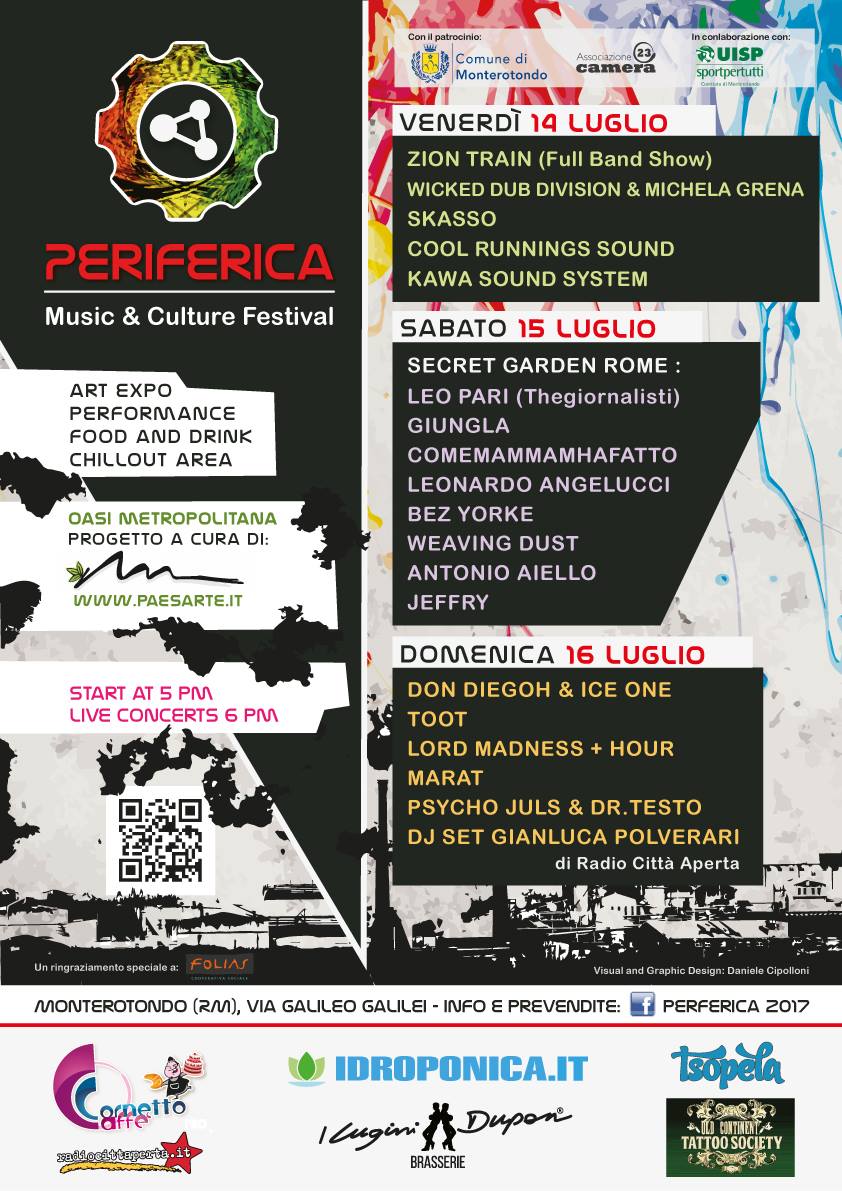 Periferica, in questa edizione 2017, che partirà dalle ore 17:30 di ciascuno dei tre giorni del festival, vedrà salire sul palco venerdì 14 luglio Zion Train (Full Band Show), WICKED DUB DIVISION & Michela Grena, SKASSO e nella Dancehall area COOL RUNNINGS SOUND in staffetta con Kawa Sound System, mentre sabato 15 luglio la serata, organizzata in collaborazione con il Secret Garden Rome, ospiterà Leo Pari (from Thegiornalisti), GIUNGLA, COMEMAMMAMHAFATTO, Leonardo Angelucci, Bez Yorke, Astrea & Stefano Proietti aka Weaving Dust, Antonio Aiello, Jeffry; e a chiudere il Periferica 2017 domenica 16 luglio: Don Diegoh & Ice One, TOOT, LORD MADNESS + Hour, Marat, Psycho Juls & Dr. Testo, feat. Mind The Flow, con Dj set di Gianluca Polverari di Radio Città Aperta, le selezioni musicali durante la giornata saranno a cura di Antonio Walls Mura, Yuri Yurss Tancioni, Afrodbsound!