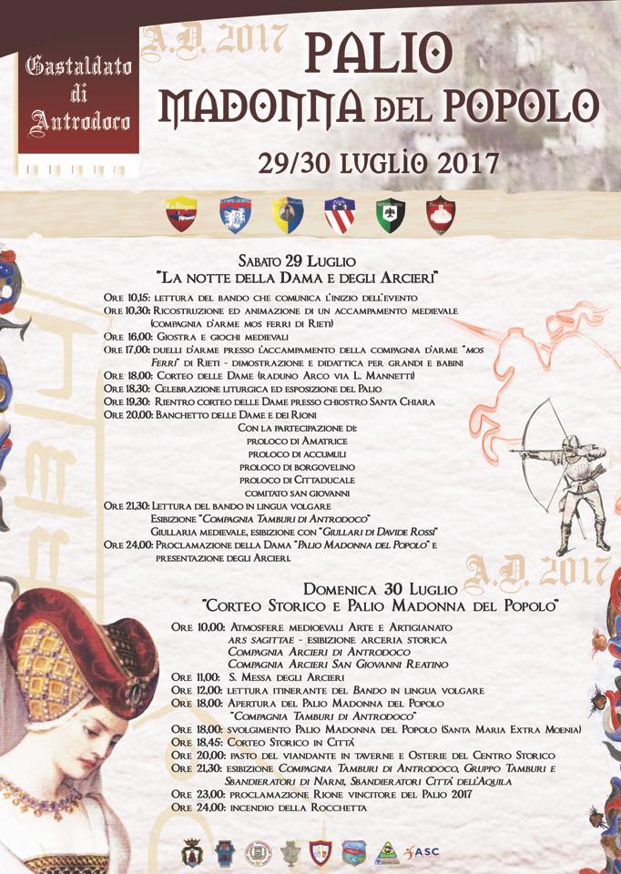 Quella del 30 luglio sarà una lunga giornata che si aprirà già alle 10 con le atmosfere medievali Arte ed Artigianato e le compagnie di arcieri di Antrodoco e di San Giovanni Reatino, e che proseguirà con il Palio Madonna del Popolo nel piazzale di Santa Maria Extra Moenia e con il Corteo storico: centinaia di figuranti sfileranno per il centro di Antrodoco in abiti realizzati per l’occasione, seguendo bozzetti che ricalcano fedelmente documenti e dipinti del tempo; il paese sarà così “invaso” di dame e cavalieri, alfieri, eserciti con armi, mezzi di trasporto del tempo; e ancora animali, cortigiani, giullari, damigelle e popolani. E sarà festa anche in serata, con il pasto del viandante nelle taverne e osterie del centro storico, le esibizioni dei tamburi e sbandieratori di Narni, degli sbandieratori citta de L’Aquila e della compagnia Tamburi di Antrodoco. Dalle 23 in poi il gran finale, con la proclamazione del Rione vincitore del Palio 2017 e l’incendio della Rocchetta che darà a tutti l’appuntamento al prossimo anno.