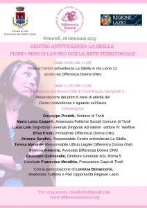 Sarà presentata domani, venerdì 18 gennaio, la relazione relativa ai primi sei mesi di attività del Centro Antiviolenza “La Sibilla” di Tivoli, aperto dal Comune di Tivoli con la collaborazione e il finanziamento della Regione Lazio e gestito dall’associazione Differenza Donna. Alle ore 10 è prevista una visita al Centro, in via Lione 11; alle […]