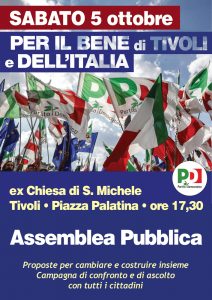 Il Partito Democratico di Tivoli ha indetto per Sabato 5 ottobre un’Assemblea Pubblica aperta a tutti i cittadini per confrontarsi sui temi della politica nazionale e locale.