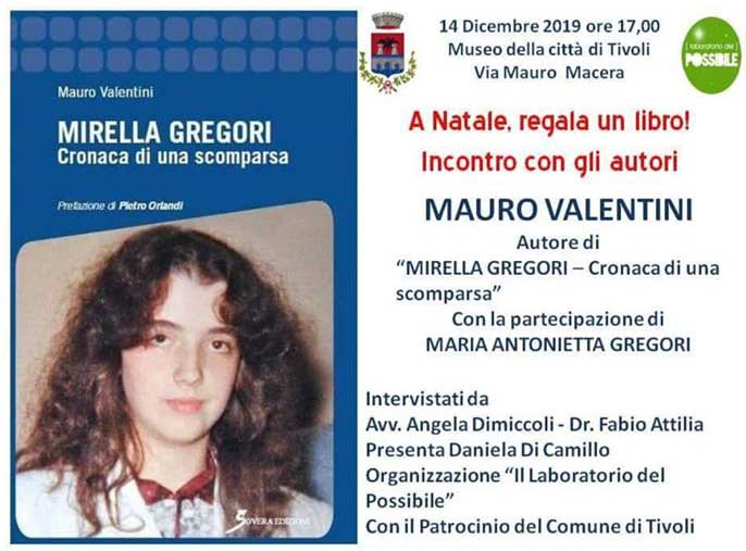 Il 14 dicembre alle ore 17 presso il Museo comunale di Tivoli il Laboratorio del Possibile organizza un incontro con gli autori del libro ” Mirella Gregori- cronaca di una scomparsa” con l’autore Mauro Valentini con la partecipazione di Maria Antonietta Gregori, intervistati da Angela Dimiccoli e Fabio Attilia. Presenta Daniela Di Camillo.