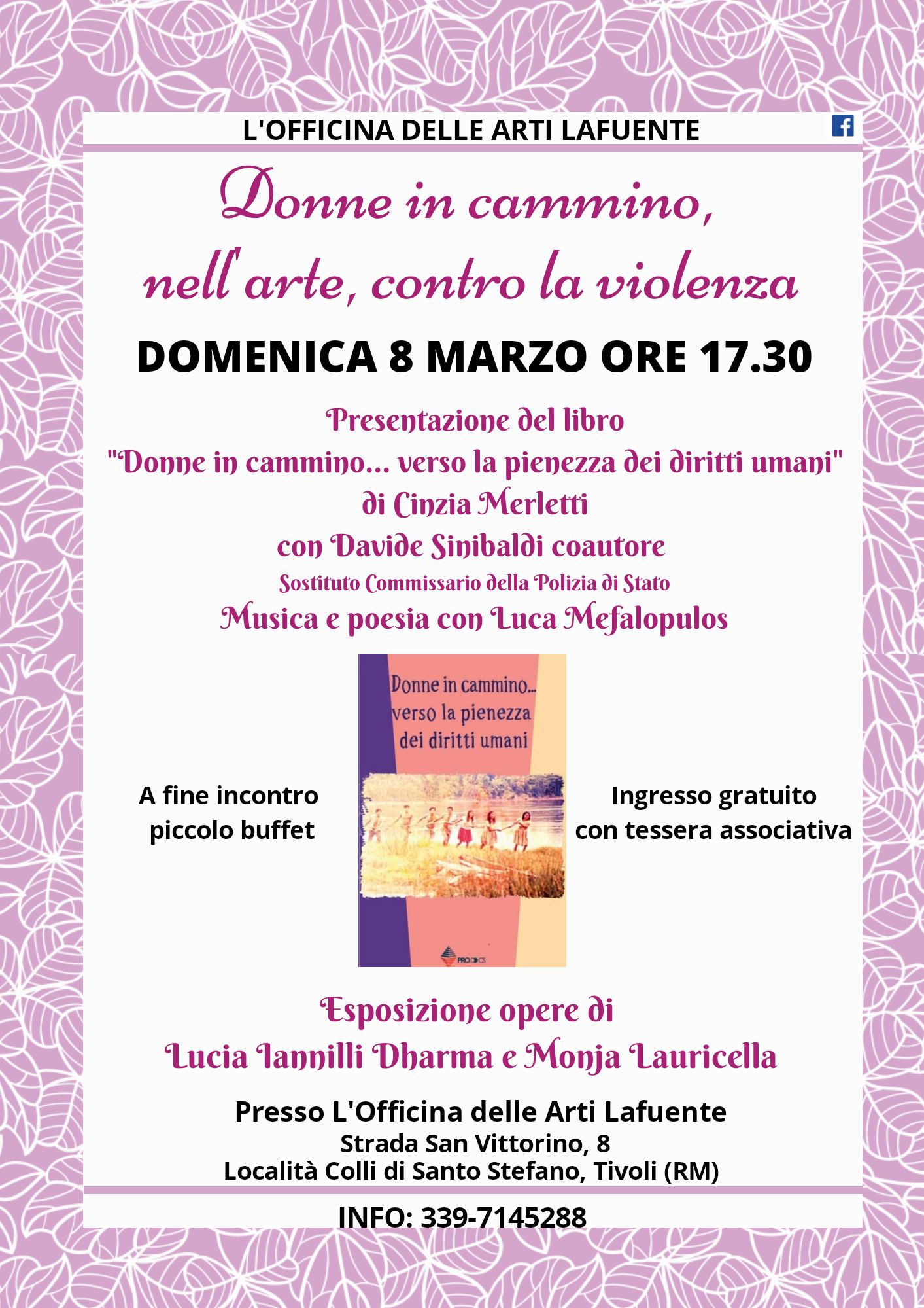 Tivoli – All’Officina delle Arti Lafuente la creatività va di pari passo con l’impegno sociale e la condivisione. Celebrare l’otto Marzo unendo musica, arte, letteratura e poesia: questa è la proposta con la presentazione del libro “Donne in cammino nell’arte contro la violenza”. L’autrice Cinzia Merletti, insieme al coautore e sostituto commissario della Polizia di Stato Davide Sinibaldi, verranno ad indicarci le motivazioni che hanno ispirato la stesura di questo libro e ad elencare una serie di azioni concrete già in essere a tutela delle donne. A fine incontro buffet offerto dall’Associazione ed un omaggio floreale per tutte.