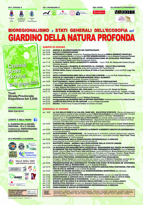 Una manifestazione che cura i molteplici e fondamentali temi contenuti nel manifesto del Bioregionalismo ed Ecologia Profonda, argomenti caldi nel panorama dei concetti che devono sempre più interessare l’opinione mondiale. Italo Carrarini ci invita all’inaugurazione del Giardino della Natura Profonda e ci racconta l’origine dell’evento: “Nello spirito che caratterizza il Bioregionalismo e l’Ecologia Profonda sabato 20 e domenica 21 giugno 2020, all’interno dell’area archeologica del “Casale Anio Novus”, a Tivoli, inaugureremo un’aiuola di 11 mq circa, ideata nel 2003 in concomitanza con il mio definitivo trasferimento in campagna.”