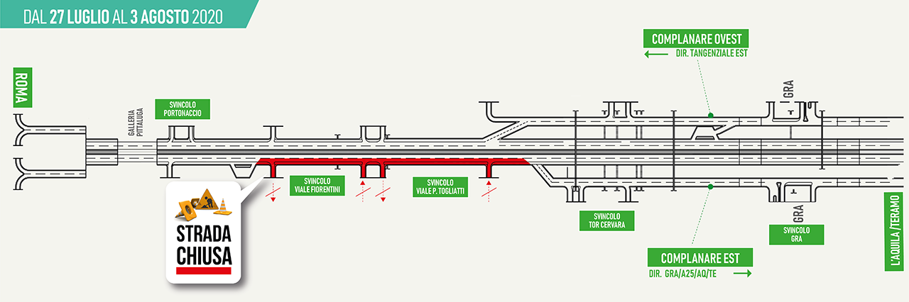  interdizione della circolazione delle due corsie (marcia lenta e veloce) tra gli Svincoli di Via F. Fiorentini e Viale Togliatti (dalla progr. km 5+500 alla progr. km 2+286) con chiusura al traffico, sia in entrata che in uscita, degli Svincoli di Via F. Fiorentini e Viale P. Togliatti; la corsia di sorpasso rimane regolarmente percorribile per raggiungere la Complanare Est, lo Svincolo di Tor Cervara, lo Svincolo del GRA e la carreggiata est dell’autostrada A24; per accedere alla carreggiata est del TPU sarà possibile utilizzare lo Svincolo di Portonaccio e le rampe della Tangenziale Est;