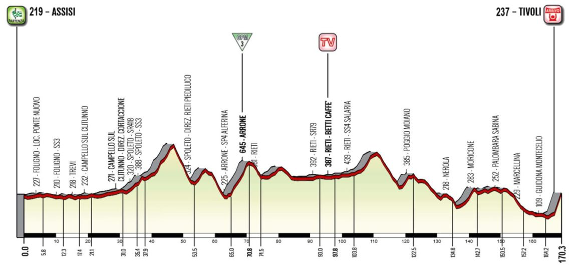 PERCORSO: Dopo una trentina di chilometri senza particolari difficoltà altimetriche, disegnati tra le località perugine di Spello, Foligno, Trevi, Campello sul Clitunno e Cortaccione, le ragazze dovranno affrontare una serie d’insidiosi saliscendi a Spoleto, Arrone, dove sarà collocato un G.P.M. di terza categoria (al km 70,800), Rieti e Poggio Moiano (Ri). Proprio a Rieti la competizione si ravviverà ulteriormente al traguardo volante al chilometro 97,800. Superate le località laziali di Nerola (km 134,800), Moricone (km 142,600), Palombara Sabina (km 146,200) e Marcellina (km 157,200), la carovana rosa affronterà una lunga discesa fino a Tivoli (località Villa Adriana, km 167,600), dove incomincerà la salita conclusiva verso il centro storico tiburtino.