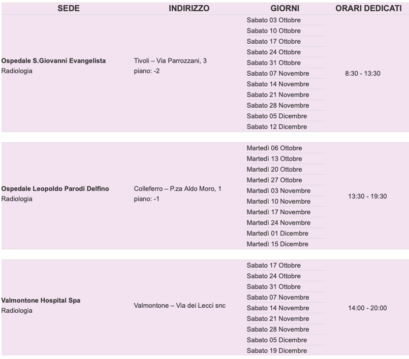 La mammografia potrà essere eseguita nella ASL Roma 5 presso le sedi riportate in tabella nei giorni e orari dedicati.