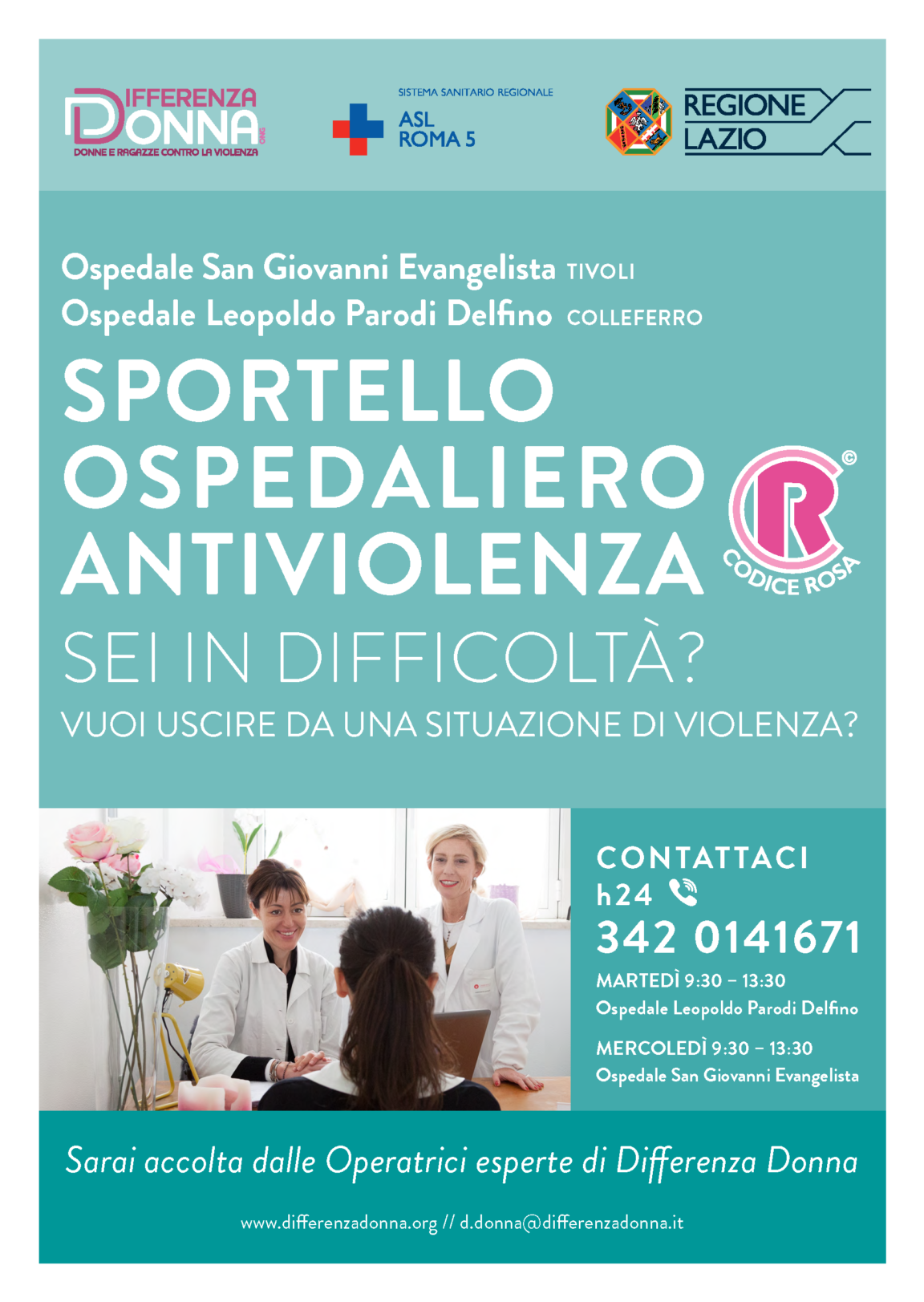 “Prendera’ in via il prossimo 1 dicembre il ‘Codice Rosa’ a Tivoli e Colleferro, progetto nato dalla collaborazione con l’Associazione Differenza Donna e frutto di un grande lavoro di rete. . Risponderanno operatrici specializzate che si recheranno ogni giorno, dal lunedi’ al venerdi’, in ospedale a Tivoli qualora una donna vittima di violenza arrivi in Pronto Soccorso.