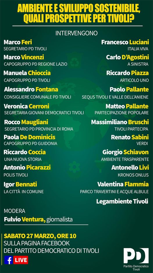 L’obiettivo di questa iniziativa è ascoltare e confrontarsi attraverso l’esperienza di chi ha un ruolo attivo sull’ambiente, e di chi ha un ruolo attivo politicamente, perché questo tema interessa tutti noi, e la politica ha l’obbligo di proporre una visione e un progetto serio su questo tema. L’appuntamento è il 27 marzo alle ore 10 sulla pagina Facebook del Partito Democratico – Tivoli