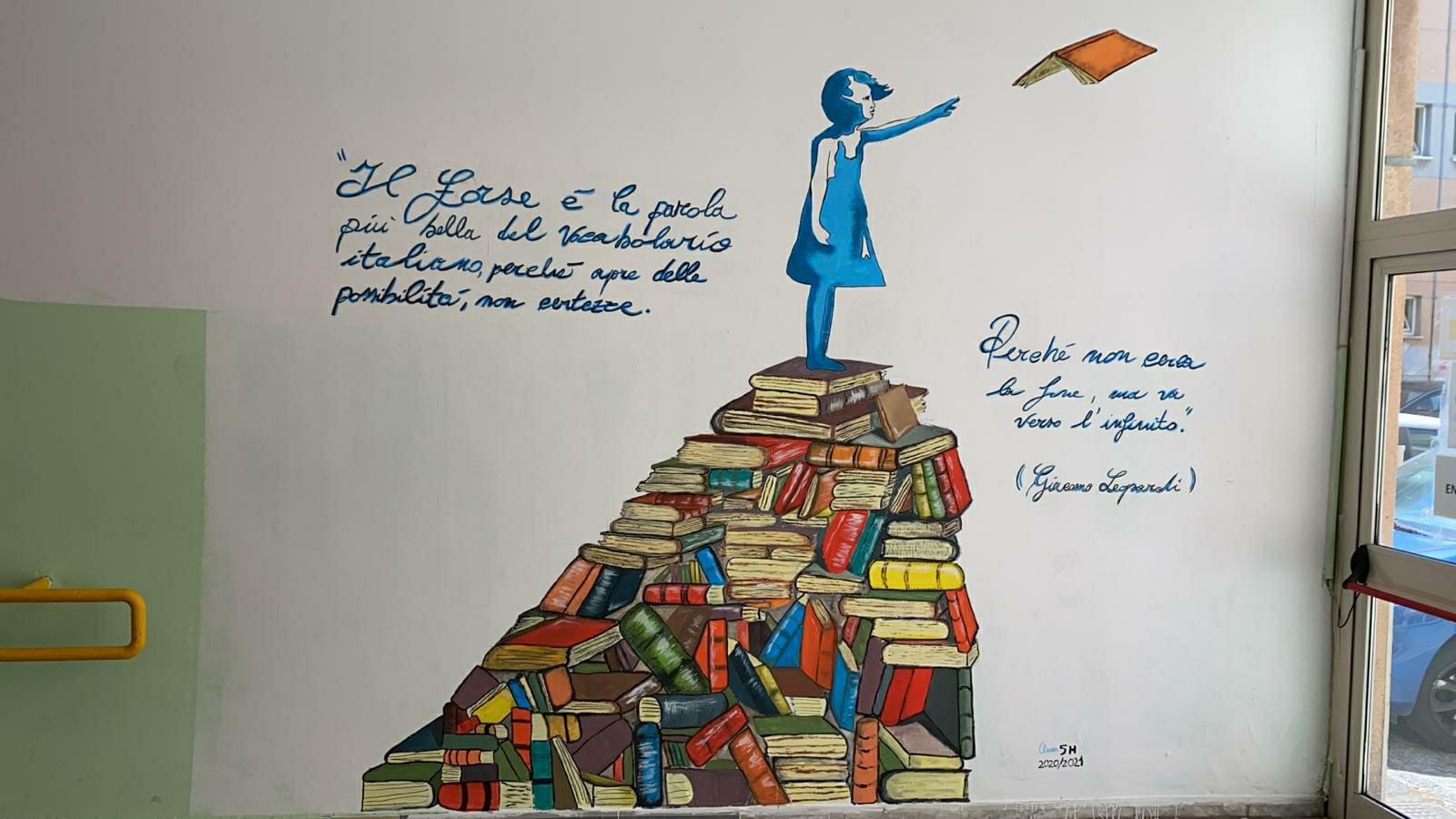Il primo murales è stato progettato dalla classe 5H citando una frase di Leopardi; “Il forse è la parola più bella del vocabolario perché apre delle possibilità, non certezze. Perché non cerca la fine, ma va verso l’infinito”. L’ immortale Leopardi si fonde con l’era contemporanea della street art dando vita ad un murales che nasce dalle radici antiche della letteratura (frase di leop. E libri) si afferma nell’odierno con un’opera simbolo dell’attuale street art (bambina di Banksy) dando una prospettiva aperta verso il futuro con un libro che vola verso il cielo ricordando la forma di un gabbiano in volo. L’opera è stata ideata dagli studenti C.N, F.C. e A.L.