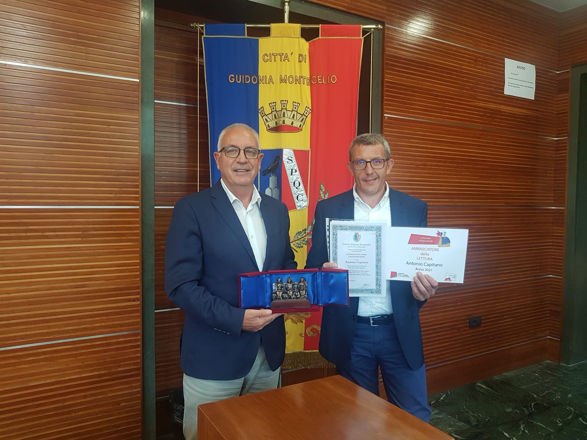 Il Sindaco Michel Barbet ed il Presidente della Commissione Cultura Matteo Castorino hanno consegnato il premio cultura della Città di Guidonia Montecelio al dottor Antonio Capitano, nominato di recente “Ambasciatore della Lettura” dal “Centro per il Libro e la Lettura”, istituto autonomo del Ministero della Cultura.