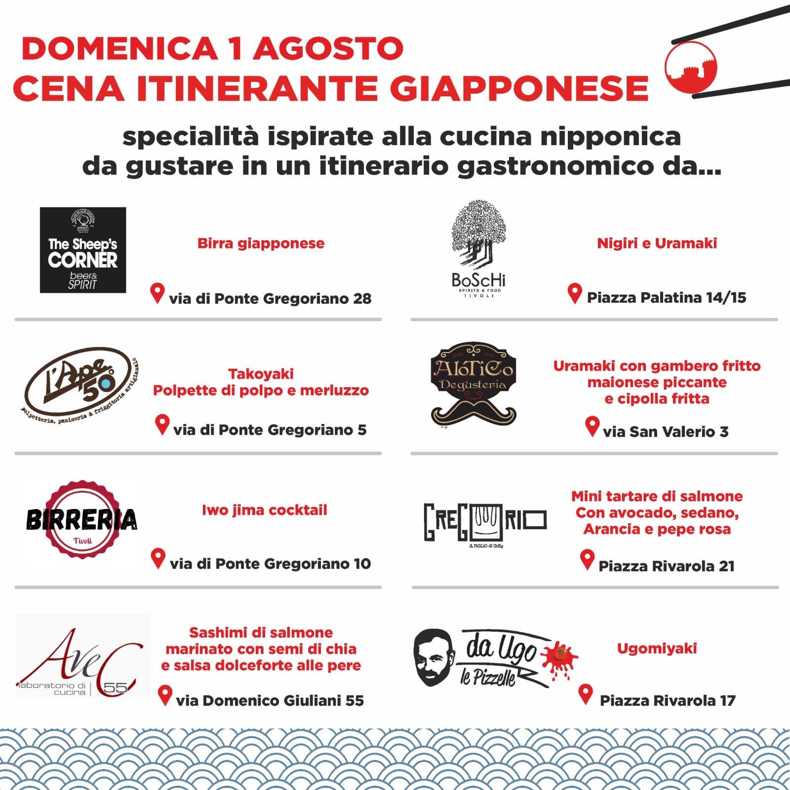 Durante il Festival del Giappone  sarà possibile effettuare un itinerario gastronomico itinerante a tema. Acquistando un ticket da 27€ si ha accesso a 8 locali differenti, ognuno con la propria originale pietanza.