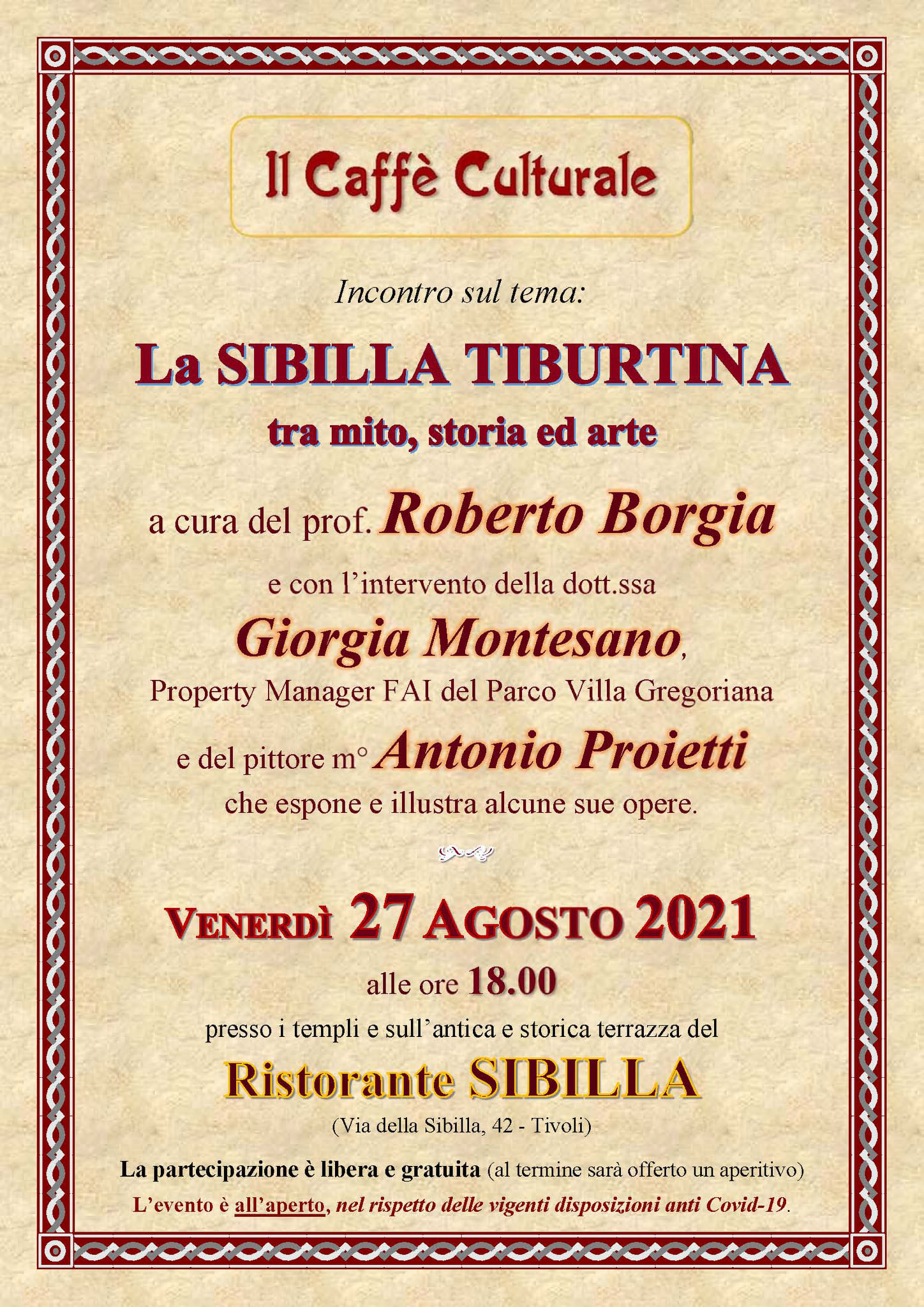 Venerdì 27 agosto 2021 alle ore 18,00 nella terrazza del Ristorante Sibilla, in via della Sibilla, 42 a Tivoli si terrà un incontro sul tema: La Sibilla Tiburtina tra mito, storia e arte, a cura del prof. Roberto Borgia e con l’intervento della dott.ssa Giorgia Montesano, Property Manager FAI di Villa Gregoriana. Il pittore Antonio Proietti esporrà e illustrerà alcune sue opere sul tema della Sibilla Tiburtina.