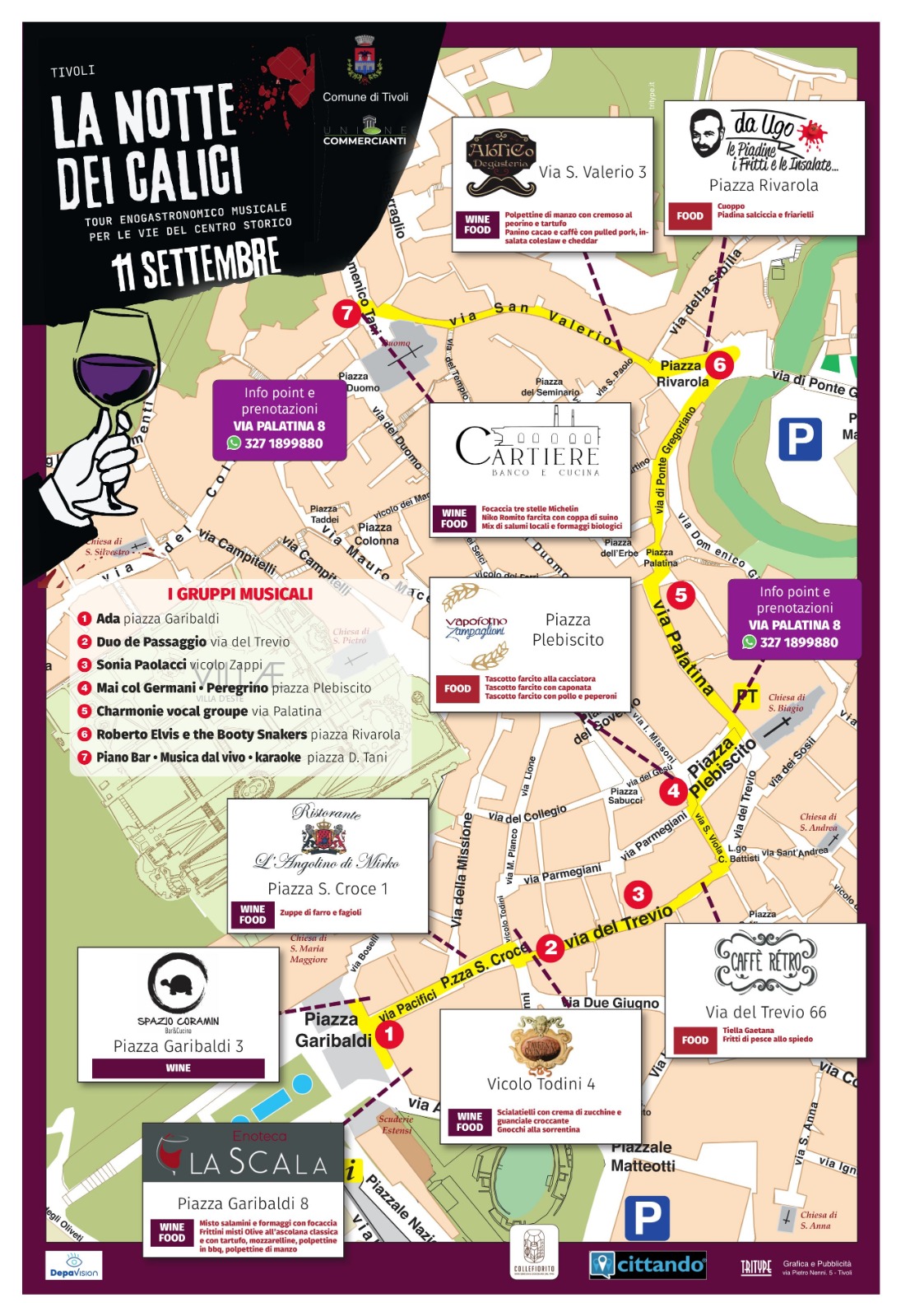 L’Unione Commercianti, con il contributo di Cantiere Turismo Tivoli, organizza l’11 settembre a Tivoli ” La notte dei calici” all’interno della manifestazioni del Settembre Tiburtino. Un tour enogastronomico musicale per le vie del centro con la possibilità di sei degustazioni in vari locali della città.