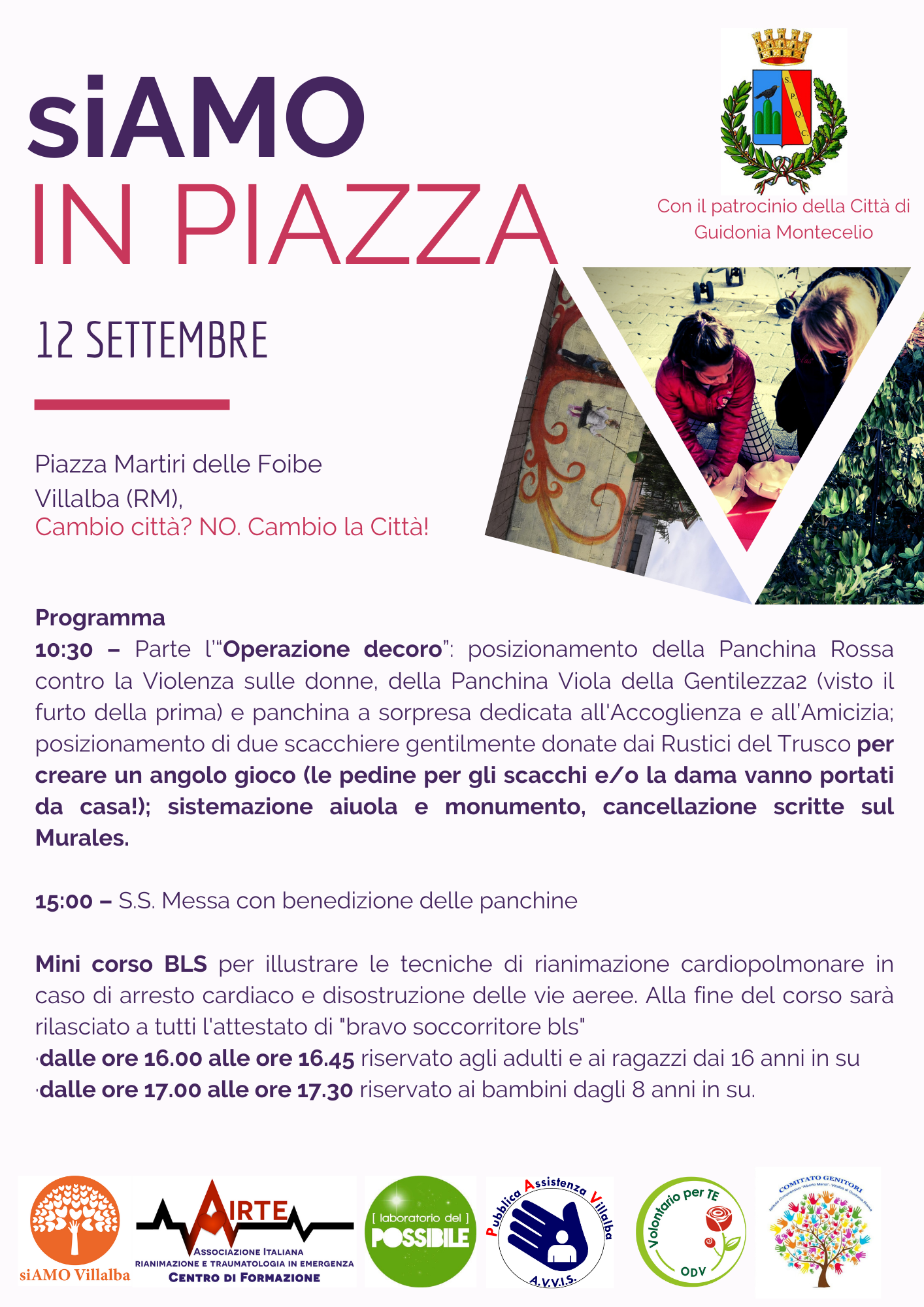 Nasce dalla collaborazione e dalla sinergia delle associazioni del territorio l’evento “siAMO in Piazza” che si terrà domenica 12 settembre a partire dalle 10.30 davanti al Plesso di via Palermo a Villalba, con il Patrocinio gratuito del Comune di Guidonia Montecelio. Un’occasione per vivere il quartiere, per stare insieme e per partecipare a quello che vuole essere un segno tangibile di una ri-nascita sociale e culturale della circoscrizione. Lo slogan è sempre lo stesso: “CAMBIAMO città? No. CAMBIAMO la città”.