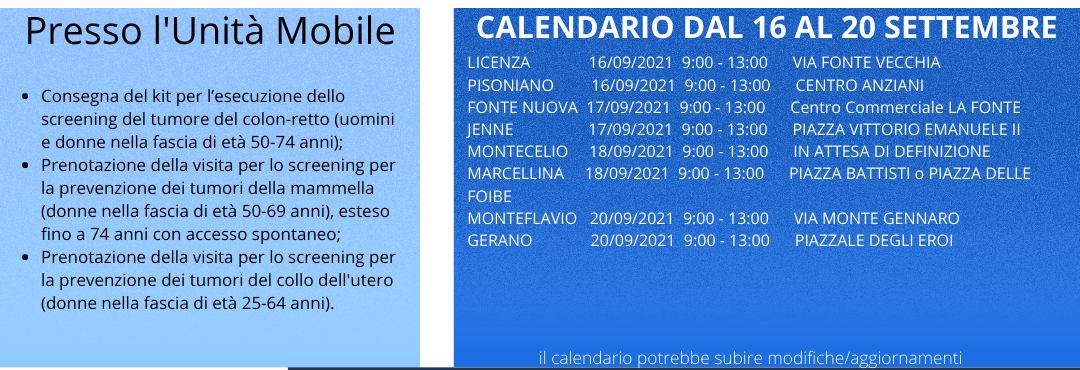 Alla luce del successo e della partecipazione ottenuti dalla precedente campagna di promozione degli screening oncologici di prossimità, realizzati con le Unità Mobili della Asl Roma 5, abbiamo deciso di ripetere l’esperienza a partire dal 16 settembre 2021.