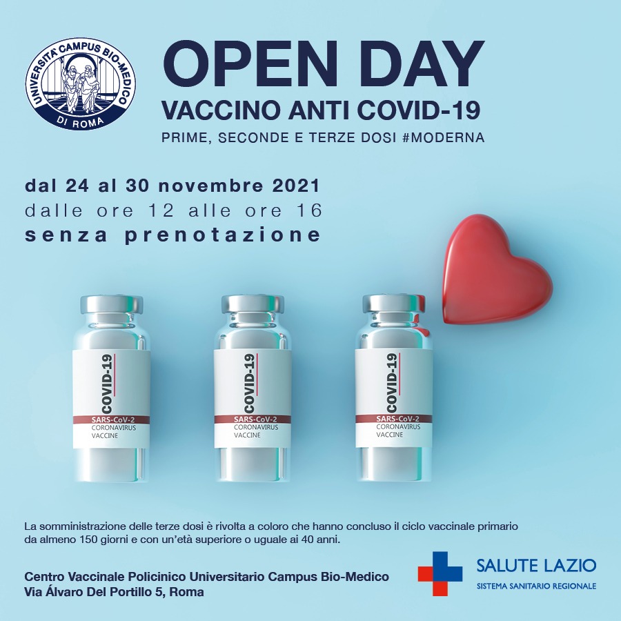 Domenica dalle 8 alle 20 ritorna in tutto il Lazio l’open day per effettuare la terza dose di vaccino anticovid 19. L’open Day è aperto senza prenotazione. La somministrazione della terza dose è riservata per chi ha concluso il ciclo vaccinale primario da almeno 150 giorni con un età superiore o uguale ai 40 anni. Inoltre, solo al Campus Biomedico tutti i giorni dalle 12 alle 16 presso il Centro vaccinale del Policlinico Universitario Campus Bio-Medico, hub vaccinale della Regione Lazio, prosegue la somministrazione del vaccino anti Covid-19. Fino al 30 novembre è possibile ricevere prima, seconda e terza dose del vaccino Moderna, senza bisogno di alcuna prenotazione presentandosi direttamente al Centro vaccinale del Policlinico Universitario dalle 12 alle 16.