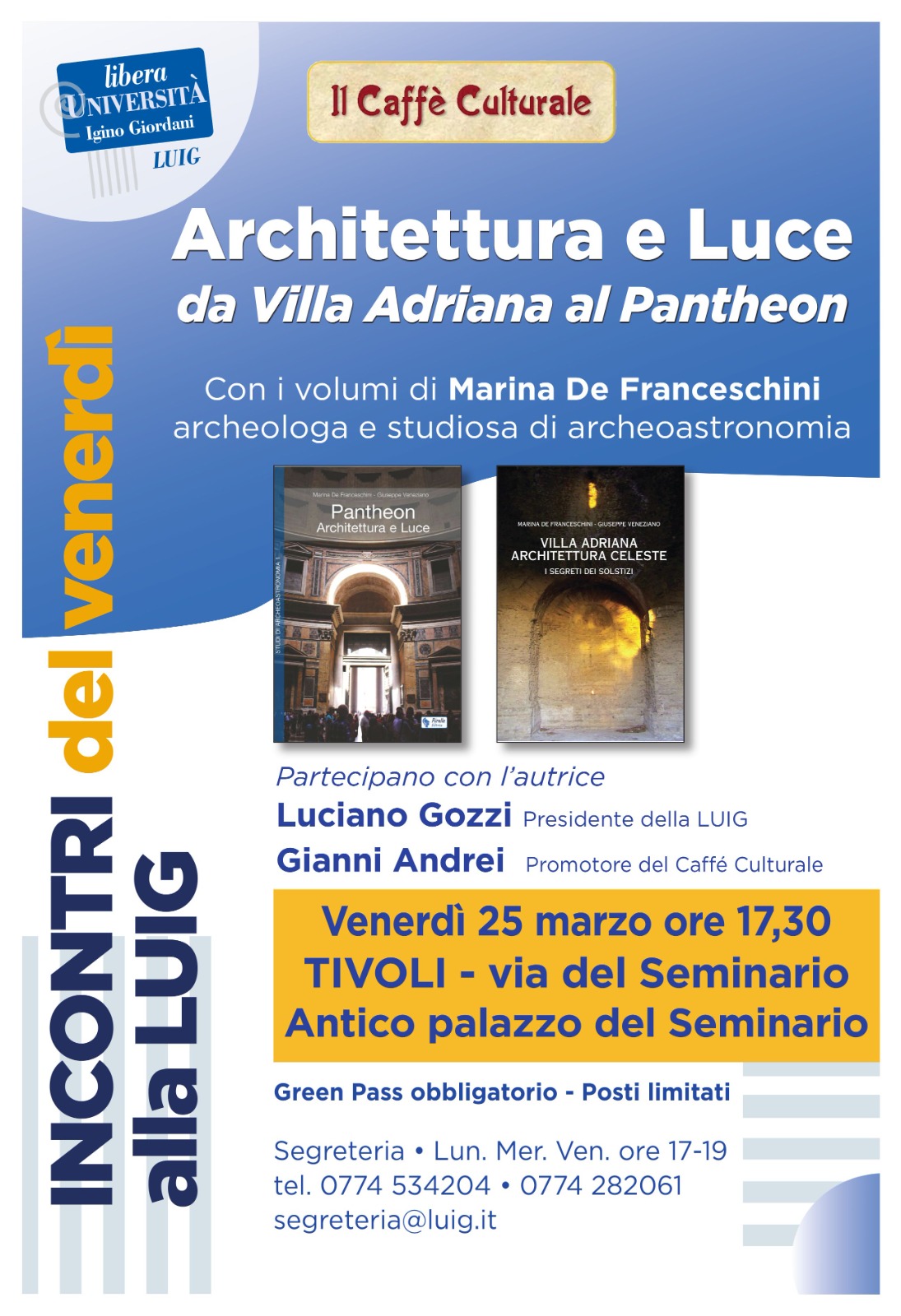 Si terrà venerdì 25 marzo alle ore 17,30, organizzata dal Caffè Letterario e dalla LUIG, presso la  (studiosa ed esperta di archeoastronomia) su “Architettura e luce da Villa Adriana al Pantheon”. Oltre alla’autrice parteciperanno Luciano Gozzi, presidente della Libera Università Igino Giordani e Gianni Andrei promotore del Caffé culturale.