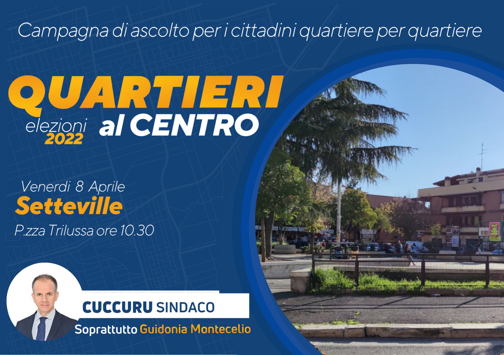 Prosegue la campagna d’ascolto “Quartieri al centro” del candidato Sindaco dell’area progressista Alberto Cuccuru che incontrerà i cittadini venerdì 8 Aprile alle 10,30 in Piazza Trilussa a Setteville.