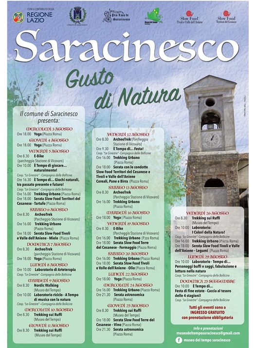 Natura, enogastronomia e avventura per tutta l’estate a Saracinesco. Programma variegato ed intenso messo in campo dall’amministrazione comunale con il contributo della Regione Lazio. Yoga, e bike, trekking urbano, serate del cibo questi alcuni appuntamenti dell’estate a Saracinesco. Diversi appuntamenti, tutti ad ingresso gratuito, da segnalare la serata astronomica in Piazza Roma, prima di aver fatto un bel trekking urbano.