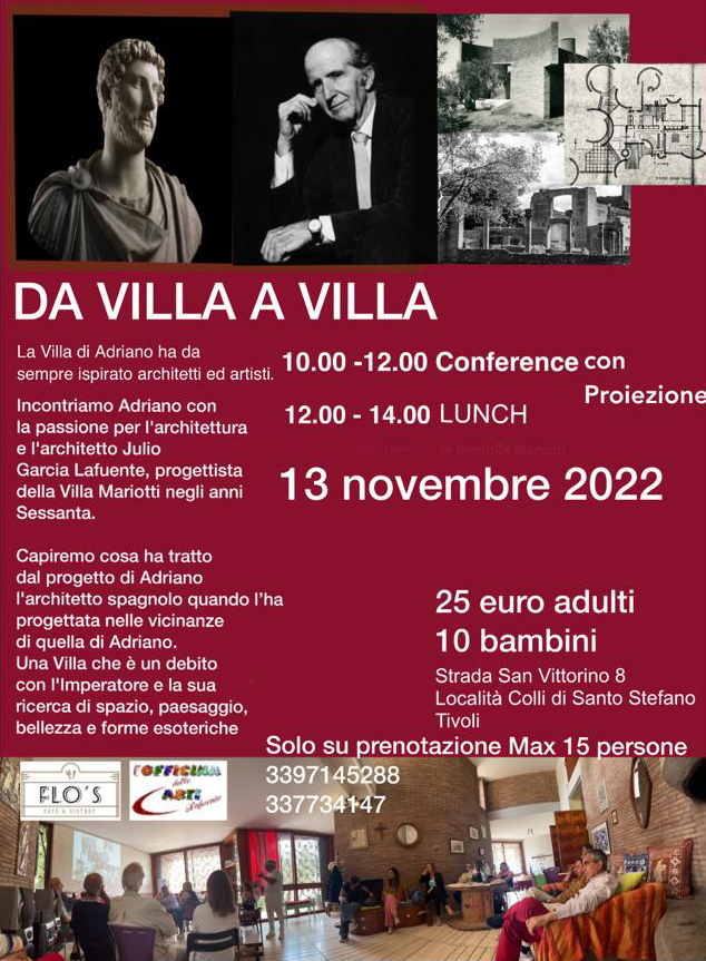 Domenica 13 novembre presso l’Officina delle arti Lafuente si svolgerà una conferenza con proiezione sul tema “Da Villa a Villa”. La villa di Adriano ha sempre ispirato architetti ed artisti, in questa giornata si parlerà di Adriano con la passione per l’architettura e l’architetto Julio Garcia Lafuente, progettista della Villa Mariotii negli anni Sessanta. Si parlerà di cosa ha tratto dal progetto di Adriano l’architetto spagnolo quando l’ha progettata nelle vicinanze di quella di Adriano. Una villa che è un debito con l’Imperatore e la sua ricerca di spazio, paesaggio, bellezza e forma esoteriche.