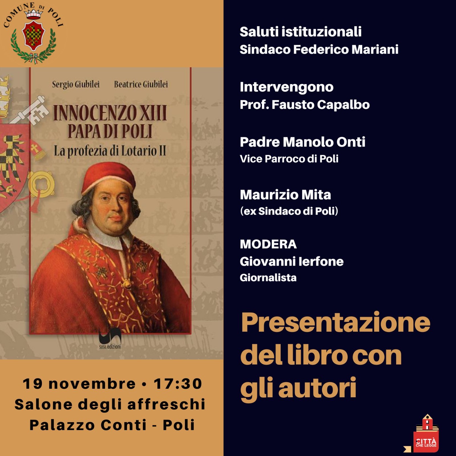 “Innocenzo XIII Papa di Poli, la profezia di Lotario II” è un libro di Sergio e Beatrice Giubilei, rispettivamente padre (sociologo) e figlia (avvocato), pubblicato da SUSIL edizioni. Lo studio critico, frutto del lavoro di molti anni, sarà presentato sabato 19 novembre a Poli nel Salone degli affreschi, al piano nobile di Palazzo Conti, proprio a ridosso della stanza dove il 13 maggio del 1655 nacque Michelangelo Conti.