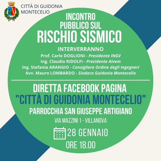 Sabato 28 gennaio, presso la Parrocchia San Giuseppe Artigiano a Villanova alle ore 18.00, si svolgerà un incontro pubblico per approfondire le tematiche del rischio sismico e del terremoto. L’incontro, organizzato dall’Amministrazione a seguito del piccolo sciame sismico che sta interessando Guidonia Montecelio, vedrà la partecipazione del professor Carlo Doglioni, presidente dell’Istituto Nazionale di Geofisica e Vulcanologia (Ingv), il massimo organo tecnico scientifico in materia.