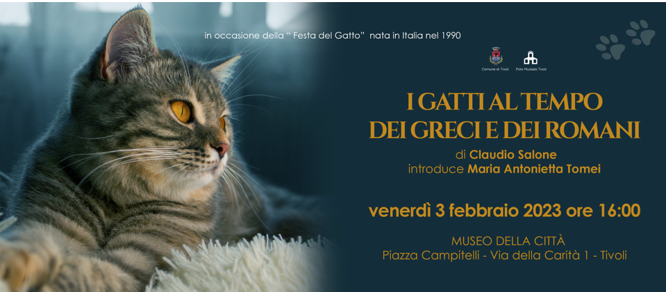 In occasione della Festa del gatto, nata in Italia nel 1990 e celebrata il 17 febbraio, venerdì 3 febbraio alle ore 16 al Museo della Città di Tivoli si terrà la conferenza “I gatti al tempo dei Greci e dei Romani”. Introdurrà l’evento la dottoressa Maria Antonietta Tomei, Consigliera del Sindaco per i Musei civici.