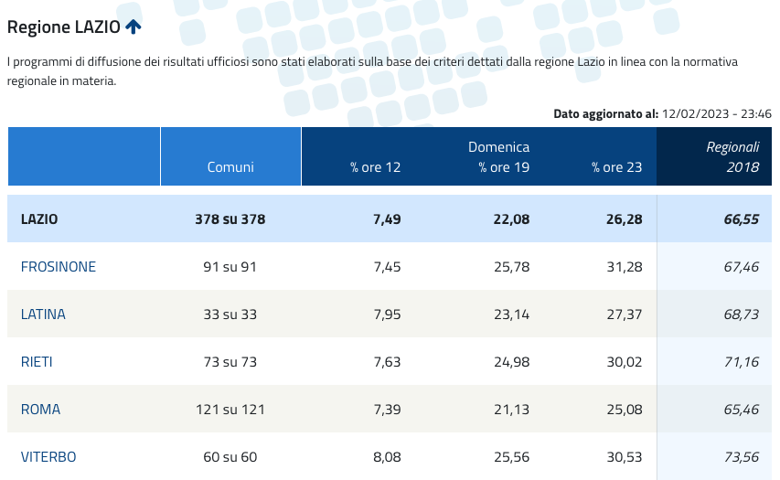 C’è tempo fino alle 15 per esprimere il proprio voto alle Regionali per eleggere il presidente della Regione e il consiglio regionale. Il dato che risalta è l’affluenza, attestata alle 23 al 26,28% che la dice lunga sul grande numero di astenuti, meno della metà delle elezioni del 2018. Da sottolineare che cinque anni fa si ovattava in un solo giorno e le regionali coincidevano con le Politiche. ricordiamo che Zingaretti vinse con il 33,27% su Parisi (31,49%), Lomabrdi (27,27%) e Pirozzi (4,94%). Esortazioni a votare su tutti i fronti, anche dai leader politici, considerando che le due regioni sono le più grandi del Paese, per votanti entrambi arrivano a 13 milioni, che rappresenta un quarto del corpo elettorale del Paese per cui sono considerate un affidabile test politico.