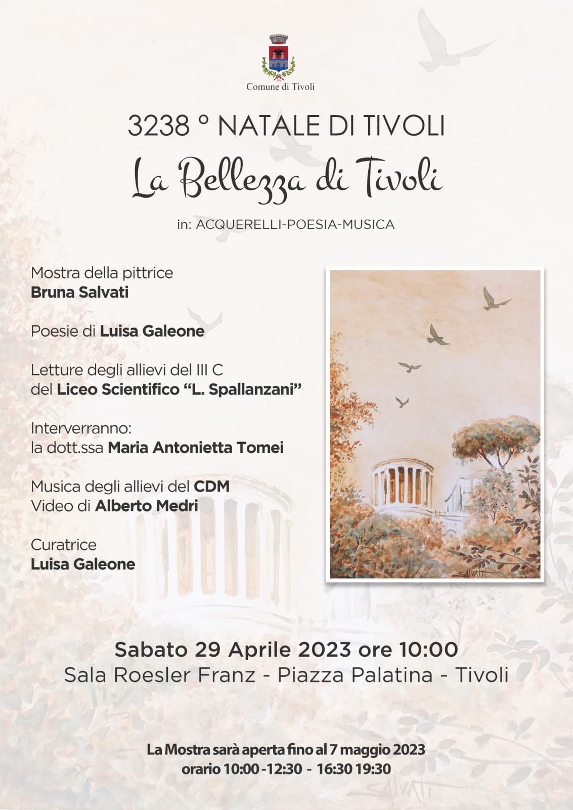 In occasione della celebrazione del 3238° Natale di Tivoli, sabato 29 aprile presso la sala Roesler Franz, in piazza Palatina, alle ore 10, si terrà l’evento dal titolo “La Bellezza di Tivoli. In: Acquerelli – musica – poesia”, al quale parteciperanno gli allievi del III C del Liceo Scientifico Lazzaro Spallanzani di Tivoli, accompagnati dalla loro prof.ssa Alessandra Scardigno, e gli allievi del CDM (Centro Diffusione Musica), con la prof.ssa Antonella Zampaglioni.