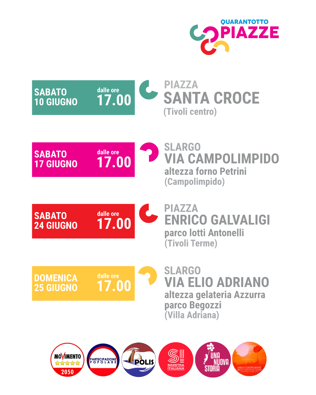 Sabato 10 giugno ore 17 a piazza Santa Croce quindi, sabato 17 giugno ore 17 a via di Campolimpido, sabato 24 giugno ore 17 al parco Lotti Antonelli di Tivoli Terme e, infine, domenica 25 giugno ore 10.30 al parco Begozzi di Villa Adriana: questi gli appuntamenti della neonata coalizione 48Piazze che ha come obiettivo la fase di ascolto e dialogo con i cittadini.