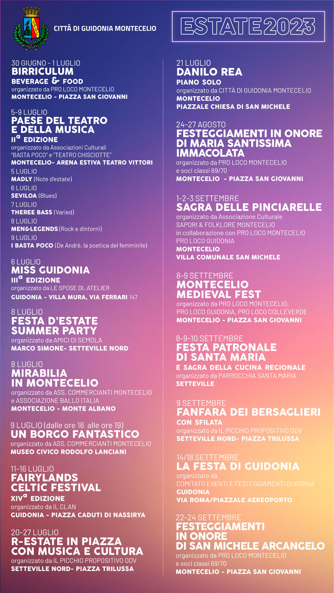 Concerti, feste e spettacoli animeranno l’estate di Guidonia Montecelio. Fino a settembre la Città offrirà, anche grazie all’importante impegno di tante realtà associative, un ricco programma di appuntamenti tra cui spiccano il ritorno del Fairylands e della sagra delle Pinciarelle.IL PROGRAMMA: