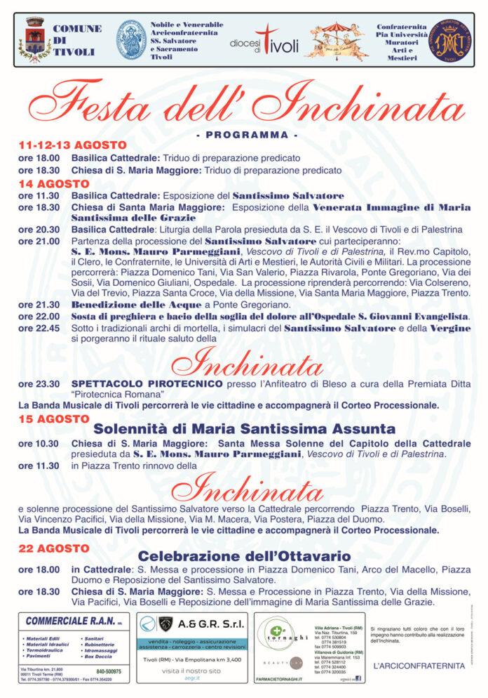 Si rinnova a Tivoli la tradizionale festa dell’Inchinata, con un triduo di preparazione nei giorni 11, 12 e 13 agosto alle 18 presso la Cattedrale e alle 18.30 presso la chiesa di Santa Maria Maggiore.