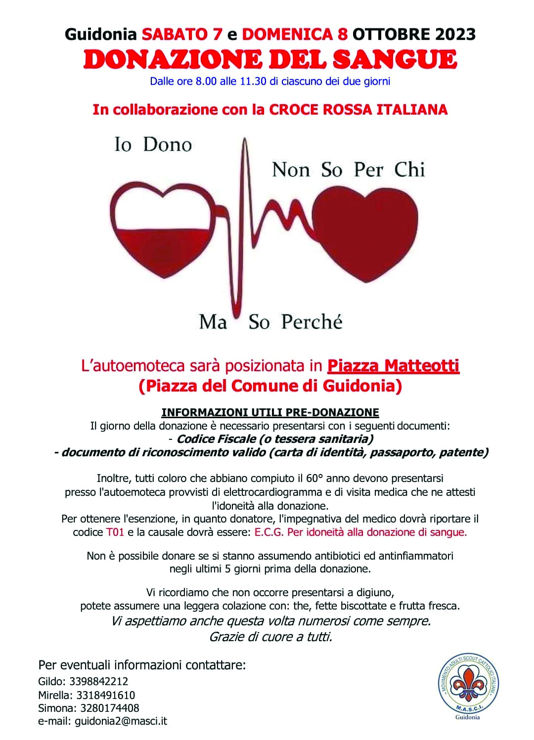 Sabato 7 e domenica 8 ottobre il gruppo scout Masci di Guidonia in collaborazione con la Croce Rossa Italiana organizzano due giornate per raccogliere sangue.