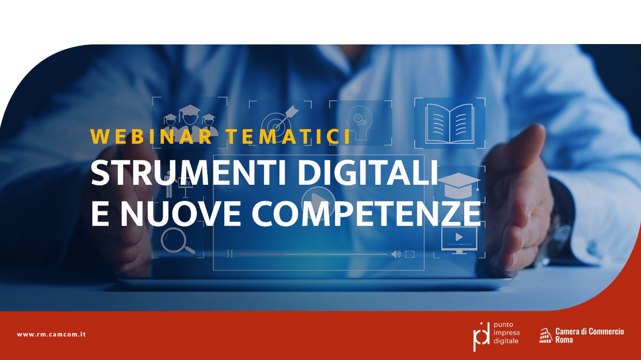 La Camera di Commercio di Roma, promuove il percorso formativo “Strumenti digitali e nuove competenze”, ciclo di webinar tematici organizzato da Forma Camera in collaborazione con PID, al fine di far comprendere l’importanza di una sempre maggiore consapevolezza delle conoscenze digitali come supporto allo sviluppo del business aziendale.
