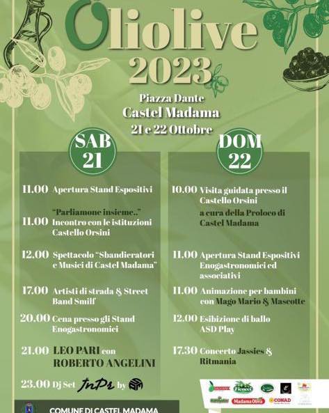 Oliolive il 21 e 22 Torna l’appuntamento con l’attesa manifestazione Oliolive. La festa dedicata alle produzioni locali per eccellenza è prevista nel fine settimana del 𝟐𝟏 𝐞 22 ottobre. Concerti, manifestazioni e stand gastronomici celebreranno i prodotti tipici, l’olio e le olive di Castel Madama.