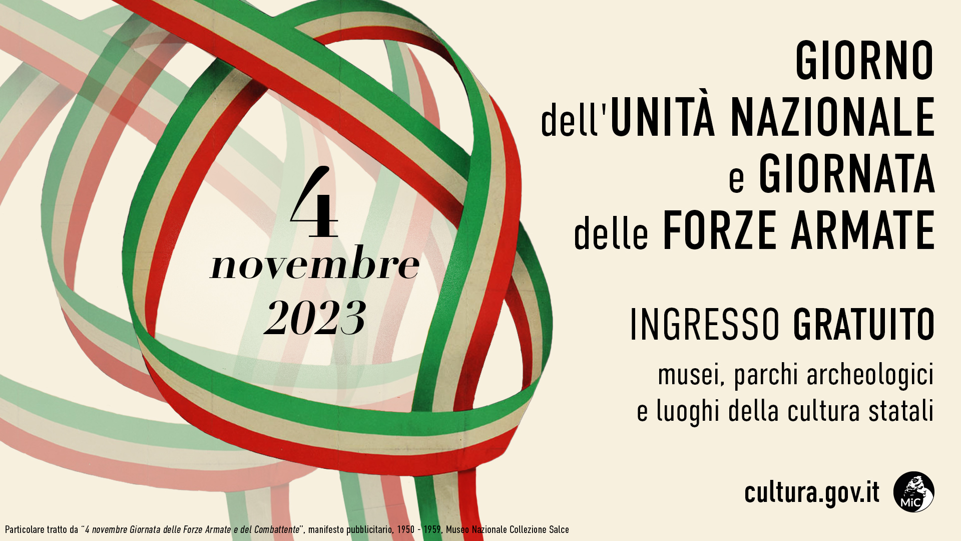 Sabato 4 novembre 2023, in occasione del Giorno dell’Unità Nazionale e della Giornata delle Forze Armate, i musei e i parchi archeologici statali saranno aperti gratuitamente, così come proposto dal Ministro della Cultura, Gennaro Sangiuliano, per la prima volta nella storia repubblicana.