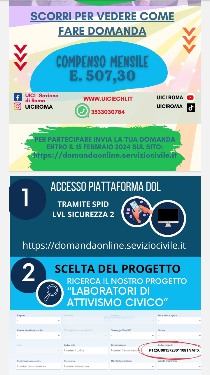 L’attività dell’Unione Italiana Ciechi a Tivoli è portata avanti dai volontari in servizio civile che ogni anno si rinnovano. A tal proposito si ricorda che c’è ancora tempo fino al 15 febbraio 2024 per presentare la domanda sul sito domandaonline.serviziocivile.it . Otto sono i posti assegnati alla sezione tiburtina per la realizzazione dei progetti da parte di ragazzi dai 18 ai 29 anni, ai quali spetterà un compenso mensile di 507,30 euro per venticinque ore lavorative settimanali dal lunedì al venerdì.(Mariarita PEZONE, UICI Tivoli)