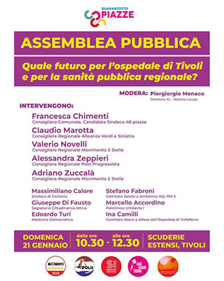 Domenica 21 gennaio alle ore 10.30 presso le Scuderie Estensi in Piazza Garibaldi a Tivoli si terrà un’assemblea pubblica dal titolo “Quale futuro per l’ospedale di Tivoli e per la sanità pubblica regionale?” , organizzata dalla coalizione 48 piazze.
