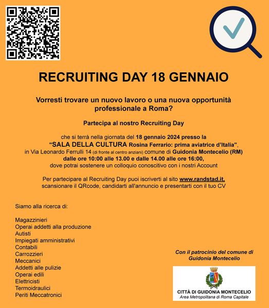 𝗚𝗶𝗼𝘃𝗲𝗱𝗶̀ “𝗥𝗲𝗰𝗿𝘂𝗶𝘁𝗶𝗻𝗴 𝗗𝗮𝘆” 𝗱𝗶 𝗥𝗮𝗻𝗱𝘀𝘁𝗮𝗱 Randstad, società che si occupa di ricerca, selezione e formazione di risorse umane, ha organizzato un “Recruiting Day” giovedì 18, presso la Sala della Cultura in via Ferrulli 14, sarà possibile presentare il CV per diverse figure professionali. Per partecipare al recruiting day devi iscriverti al sito www.randstad.it scansioni il […]