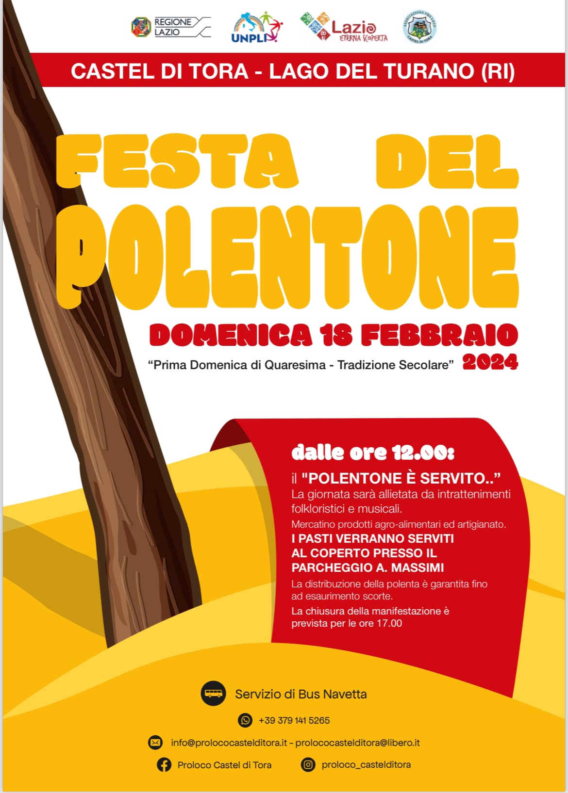 La Festa del Polentone, morbido e compatto, ha una tradizione secolare a Castel di Tora. Fino ai primi anni 70 si festeggiava il Mercoledì delle Ceneri, giorno in cui la polenta fatta con la farina di mais, risorsa principale nella vallata, veniva condita con un particolare ragù magro per indicare l’inizio della Quaresima. Gli ingredienti principali erano rappresentati dal pesce, tradizionalmente ritenuto “povero”, come aringa, tonno, baccalà e alici.