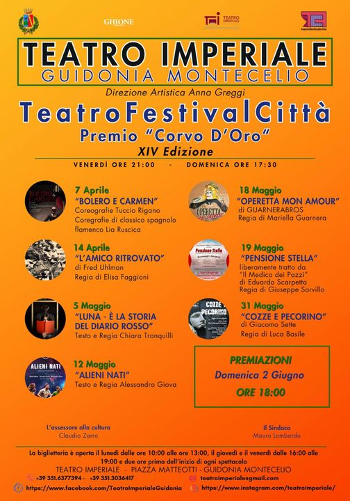 Il Teatro Imperiale di Guidonia Montecelio è pronto ad ospitare la 14° edizione del Teatro Festival Città in collaborazione con il Teatro Ghione. L’edizione, la cui direzione artistica è a cura di Anna Greggi, terminerà con la consegna del premio “Corvo d’oro” il 2 giugno. Domenica 7 aprile alle 17,30 si inizia con lo spettacolo di danza “Bolero e Carmen” mentre il 14 aprile alle ore 17.30 si svolgerà lo spettacolo “L’Amico ritrovato” tratto dal romanzo di Fred Uhlman, regia ad opera di Elisa Faggioni. la rassegna proseguirà fino al 31 maggio con spettacoli il 5, 12, 18, 19 e il 31. Sostiene questa 14° edizione l’amministrazione Comunale di Guidonia.