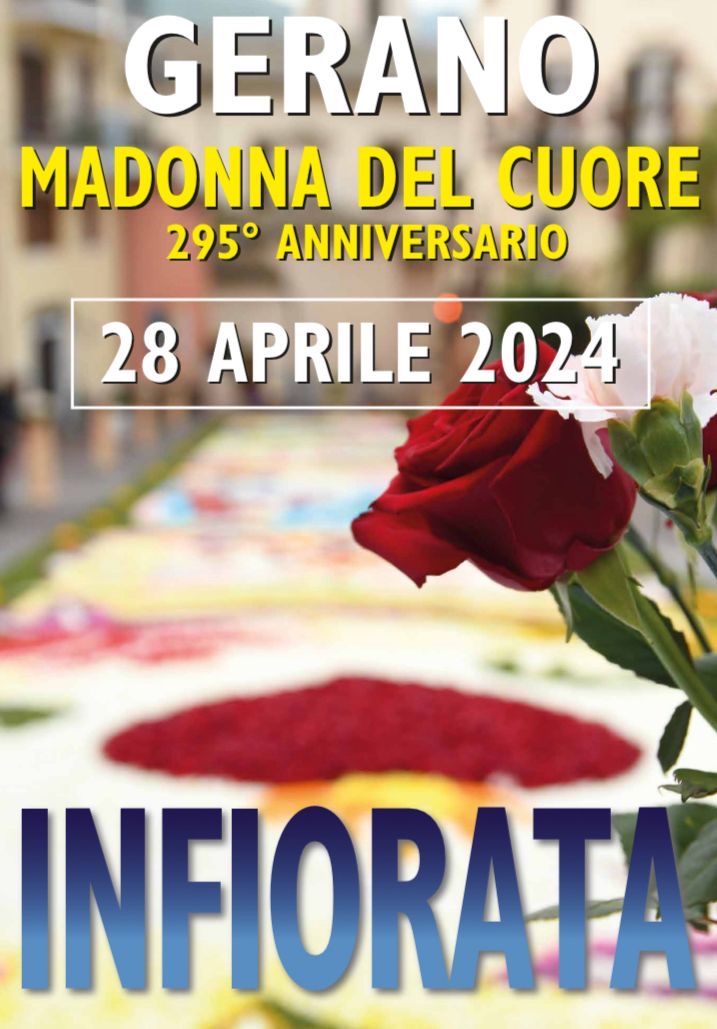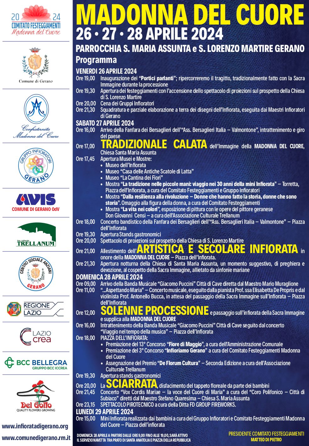 I festeggiamenti si apriranno con la tradizionale e antichissima Calata della Madonna del Cuore nella chiesa di Santa Maria Assunta il sabato della vigilia alle 17.00 presieduta dal Vescovo di Tivoli Mons. Mauro Parmeggiani. Domenica 28 alle 11.00 Messa Solenne presieduta dal Vescovo Emerito di Anagni-Alatri Mons. Lorenzo Loppa, processione e passaggio dell’Immagine sull’Infiorata che rappresenta il momento più emozionante di tutti i festeggiamenti. I lavori per l’allestimento del tappeto floreale si protrarranno per tutta la notte di sabato 27 aprile.