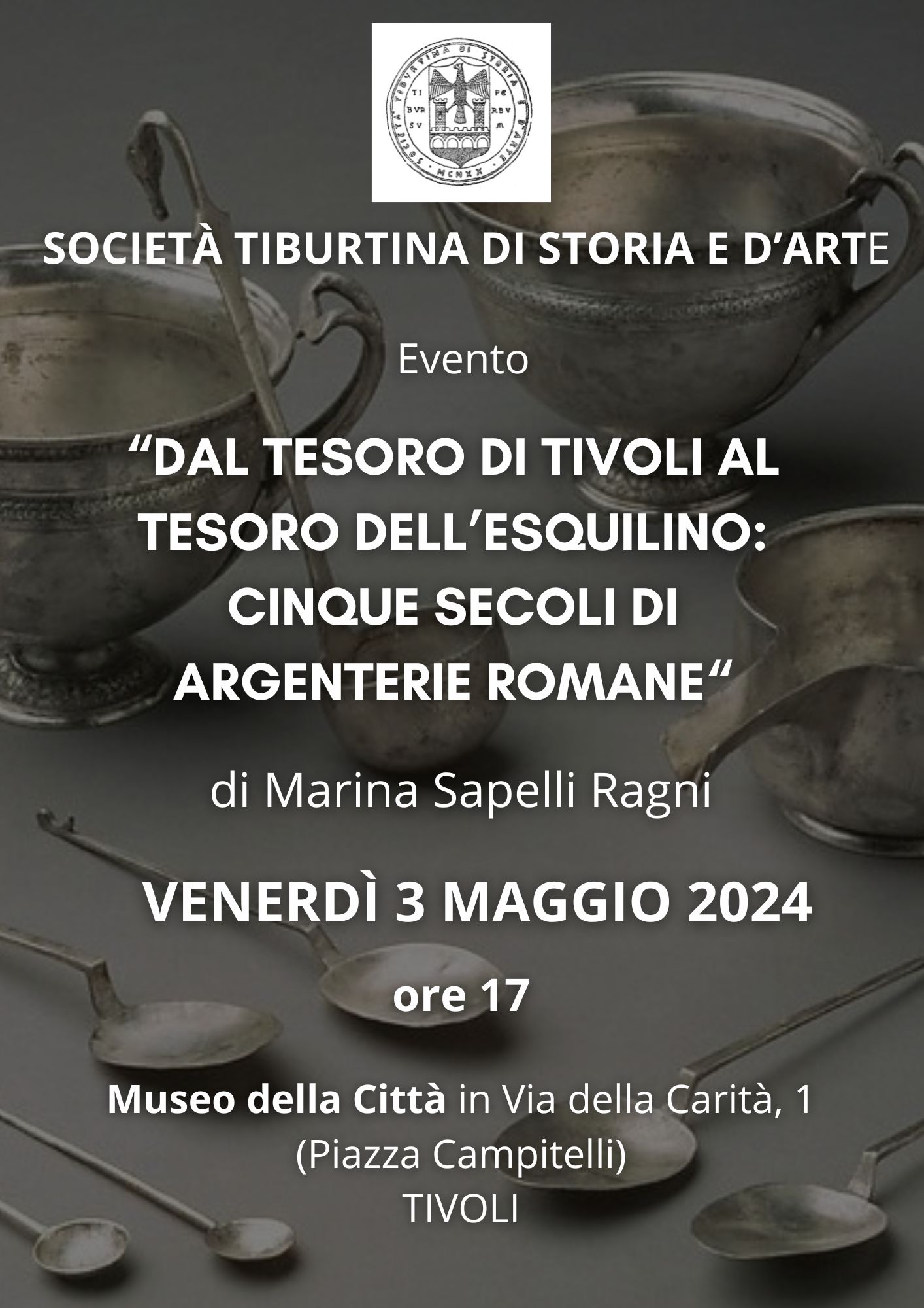 La Società Tiburtina di Storia e d’Arte organizza una conferenza tenuta dalla dott.ssa Marina Sapelli Ragni, già Soprintendente per i Beni archeologici del Lazio sul tema “Dal tesoro di Tivoli al tesoro dell’Esquilino. Cinque secoli di argenterie romane”. L’evento si svolgerà venerdì 3 maggio prossimo, con inizio alle ore 17.00, nella Sala conferenze del Museo della Città di Tivoli in via della Carità, 1 (piazza Campitelli).