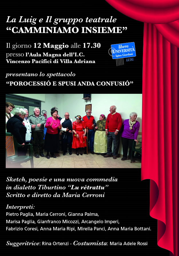 La LUIG e il Gruppo teatrale “Camminiamo insieme” il giorno 12 maggio alle ore 17.30 presso l’aula magna dell’I.C. Tivoli IV – Vincenzo Pacifici di Villa Adriana presentano lo spettacolo di sketch e poesie Precissió e spusi, anda confusió e una nuova commedia Lu rétrattu, due imperdibili omaggi al dialetto tiburtino.